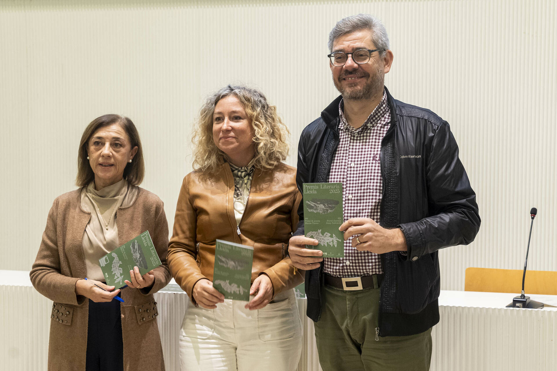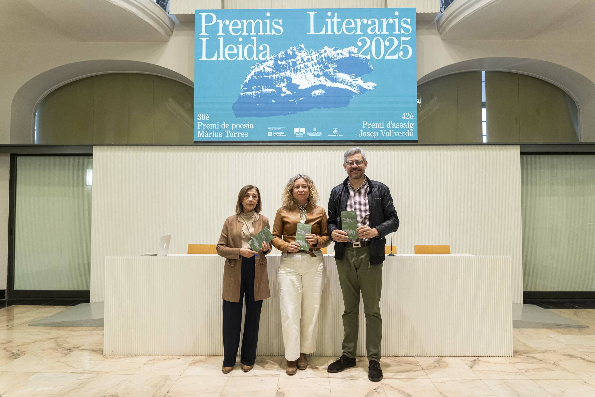 La presentació dels Premis Literaris 2025 s’ha fet aquest dimecres a la Sala Alfred Perenya de la Regidoria de Cultura de la Paeria, un acte en el qual han participat el director de l’IEI, Andreu Vàzquez; la regidora de Cultura de l’Ajuntament de Lleida, Pilar Bosch, i la responsable de publicacions de la Paeria, Rosa Mesalles, organitzadora dels actes literaris paral·lels als Premis.
