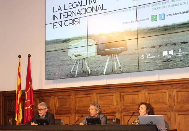 L’Institut d’Estudis Ilerdencs ha acollit aquest dimecres la segona i darrera entrega del cicle ‘La legalitat internacional en crisi’, una iniciativa organitzada per la Secció de Dret i Economia de l’IEI i que en aquesta ocasió ha tingut com a ponents el catedràtic de Dret Internacional Públic i Relacions Internacionals de la Universitat de Barcelona, Jaume Saura, adjunt general del Síndic de Greuges de Catalunya, i la catedràtica de Dret Internacional Públic i Relacions Internacionals de la UNED, Carmen Quesada, professora del Centre d’Estudis de Dret Internacional Humanitari-Creu Roja Espanyola. La sessió ha comptat amb la presència del director de l’IEI, Andreu Vàzquez.
