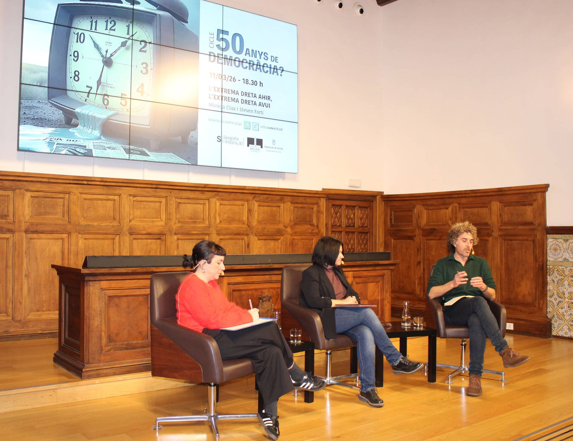 L’Aula Magna de l’IEI ha acollit avui la cinquena conferència del cicle ‘50 anys de democràcia?’. Amb el títol ‘L’extrema dreta ahir, l’extrema dreta avui’, la sessió ha anat a càrrec de la catedràtica en Ciències Polítiques i professora de la Universitat Pompeu Fabra, Mònica Clua, i l’historiador i professor de la UAB Steven Forti, especialitzat en l’estudi dels feixismes, nacionalismes i extremes dretes a l’època contemporània. El director de l’IEI, Andreu Vàzquez, ha assistit a la xerrada, que ha estat presentada i moderada per la politòloga i sociòloga Mariona Lladonosa, comissària del cicle.