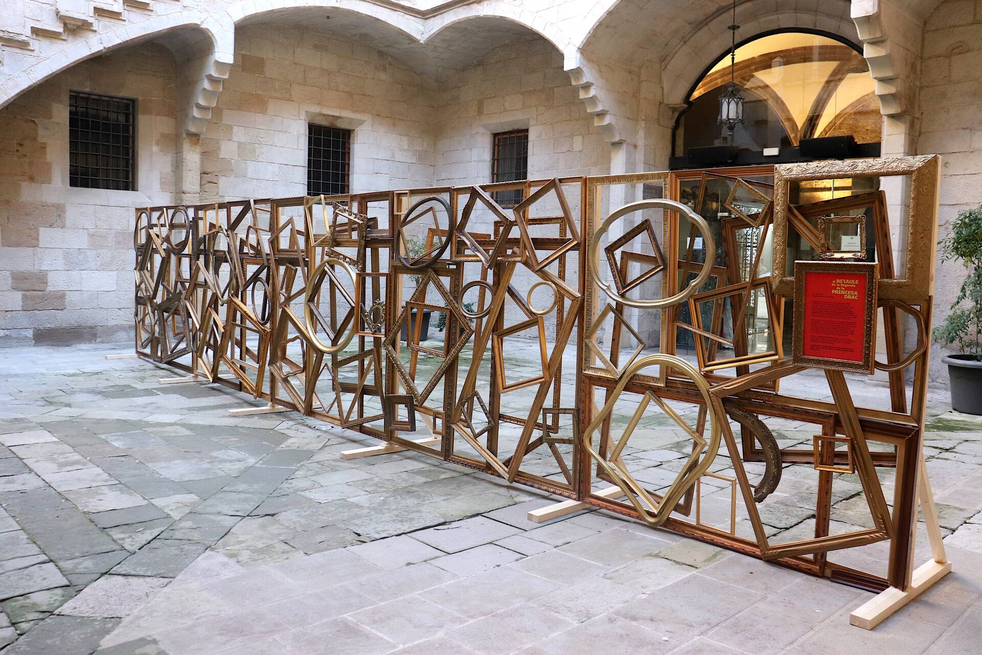 La creació ‘Retaule de la llegenda de la princesa drac’, que es podrà visitar al Pati de l’IEI fins al 25 d’abril, consisteix en un gran panell de 10 metres per 2 format per marcs de fusta daurats de diferents formes i mides. L’obra, amb la col·laboració tècnica de Jaume Ramon ‘Dodó’, proposa una reinterpretació de la llegenda de Sant Jordi en clau oberta i contemporània.