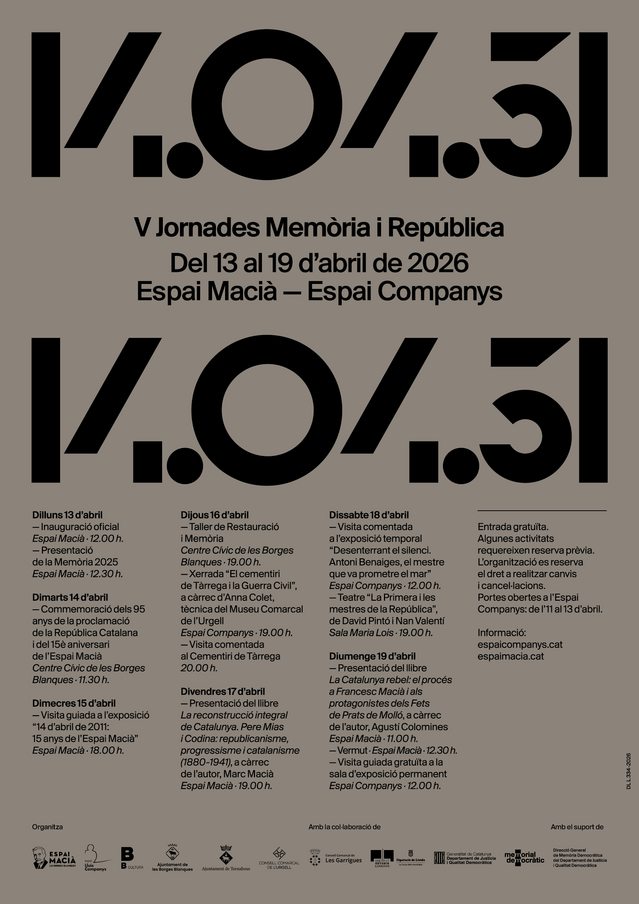 Dimarts 14 d'abril, l'acte institucional de commemoració dels 95 anys de la proclamació de la República Catalana tindrà lloc al Centre Cívic de les Borges Blanques a les 11:30 h.