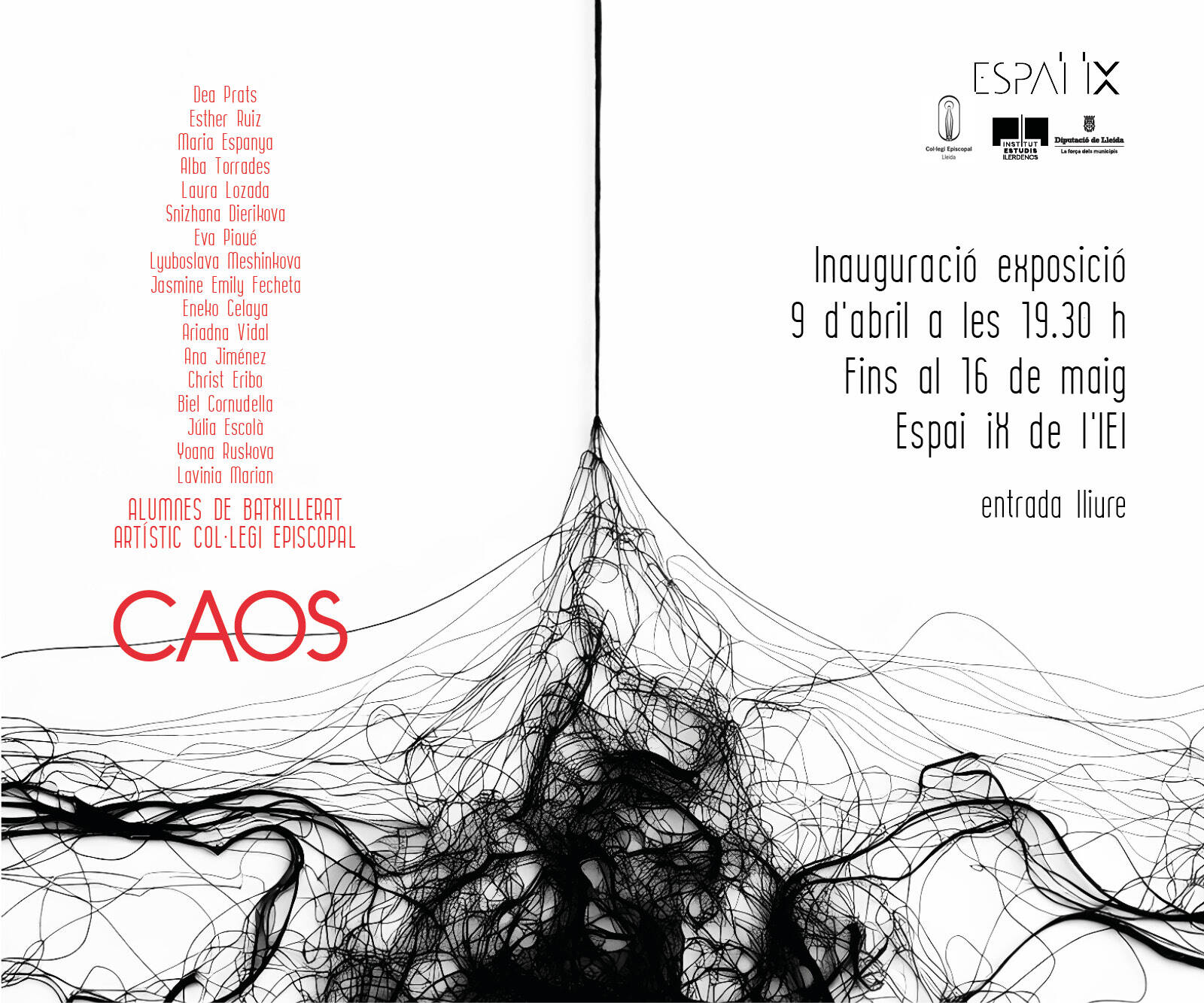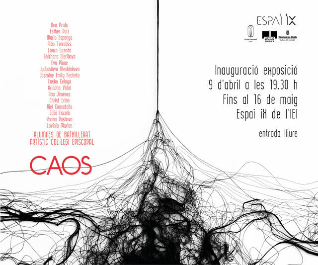 Exposició col·lectiva de l’alumnat de segon de Batxillerat Artístic del Col·legi Episcopal que s’endinsa en el concepte de caos mitjançant diversos llenguatges de l’art contemporani: object-trouvé, pintura, dibuix, escultura, vídeoart, fotografia, art conceptual i art sonor. Les propostes reflexionen sobre com el caos travessa tant l’experiència individual com les dinàmiques socials del món contemporani.