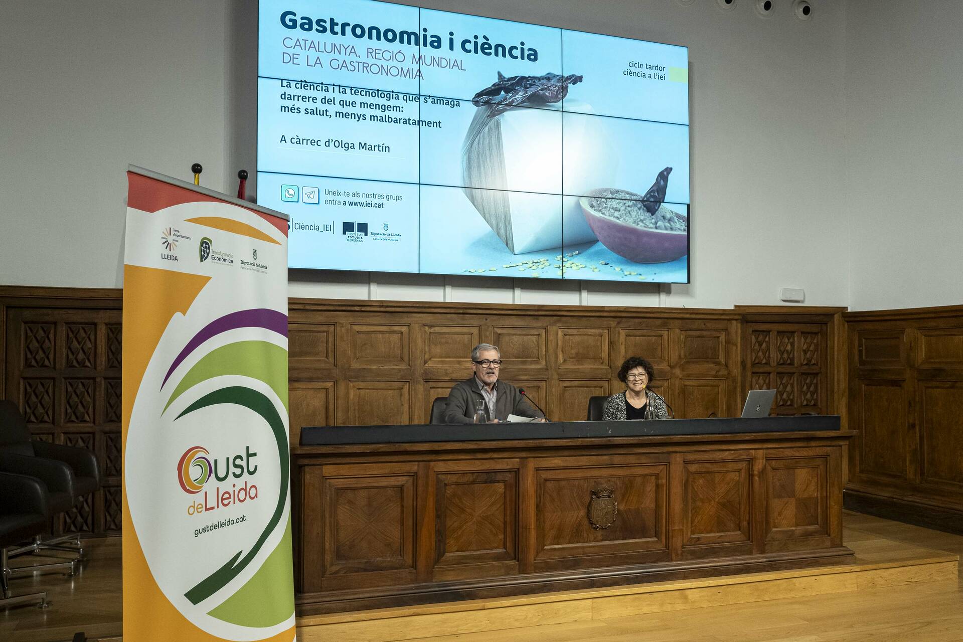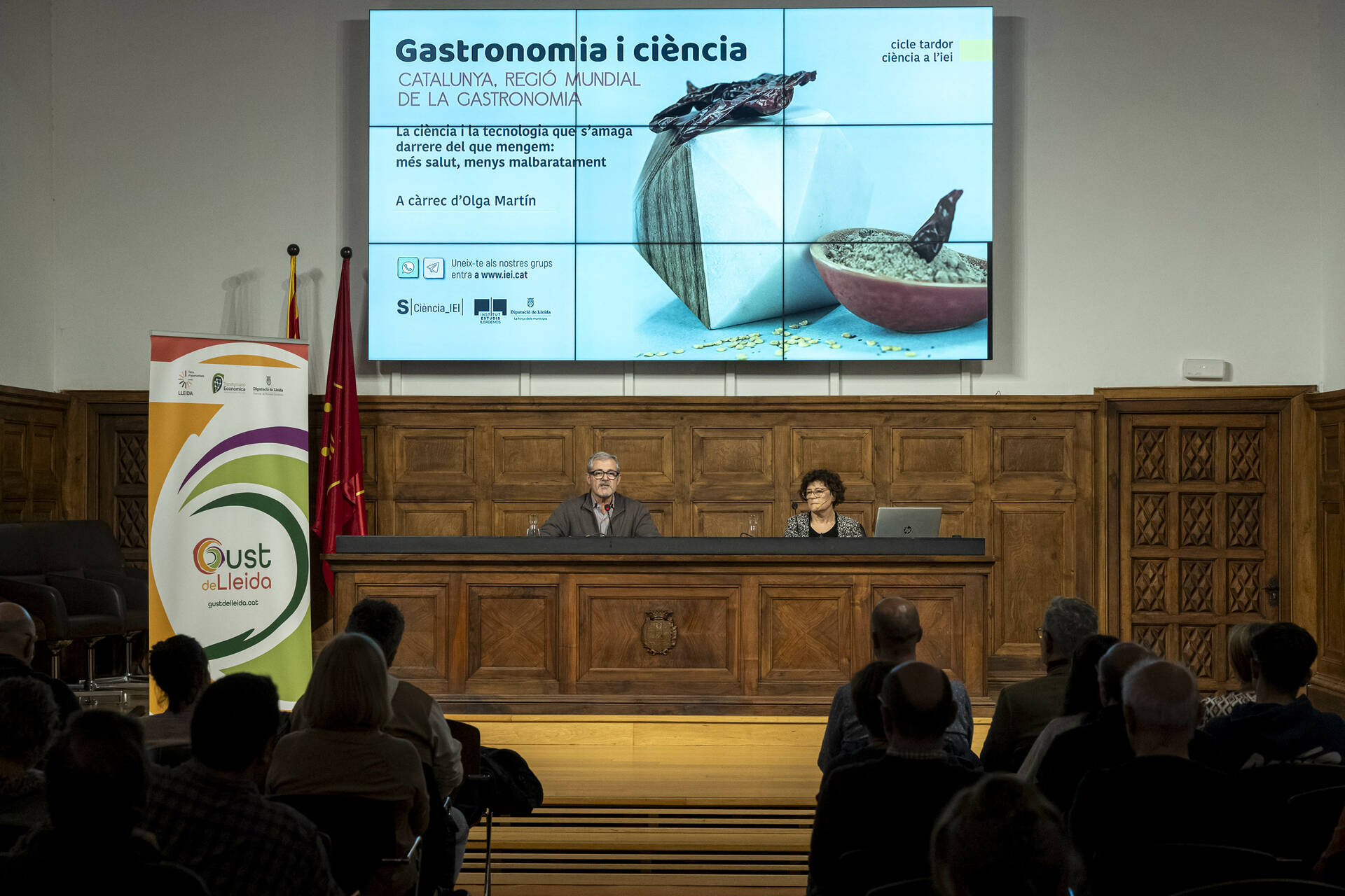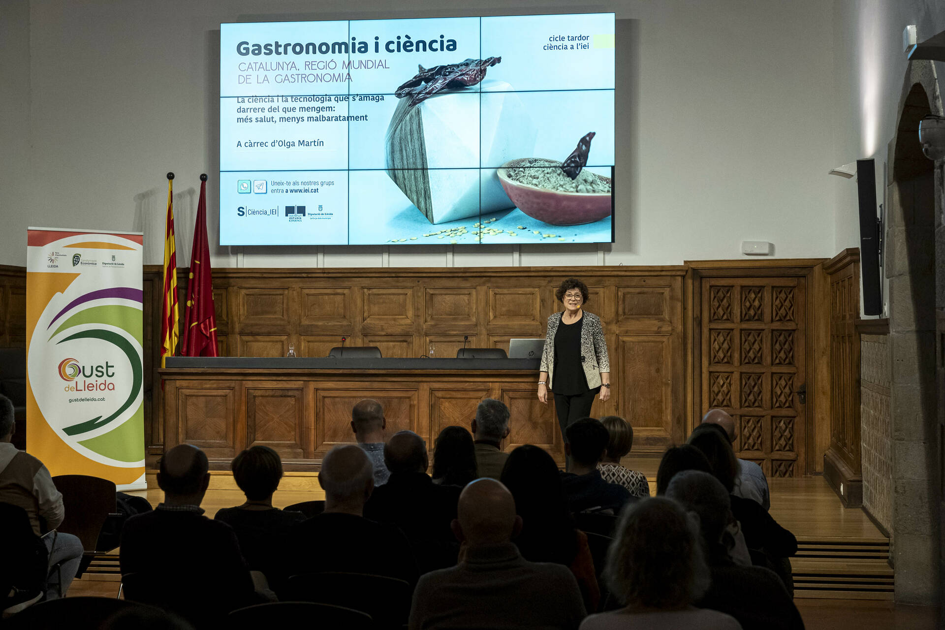 L’Aula Magna de l’Institut d’Estudis Ilerdencs ha acollit aquest dimarts la segona entrega del cicle Gastronomia i ciència a l’IEI. La ponent ha estat Olga Martín Belloso, doctora en Ciències Químiques, catedràtica de la UdL i expresidenta de la Federació Europea de Ciència i Tecnologia dels Aliments, que ha parlat sobre ‘La ciència i la tecnologia que s’amaga darrere del que mengem: més salut, menys malbaratament’. La sessió ha comptat amb la presència del vicepresident del Patronat de Promoció Econòmica de la Diputació de Lleida, Jordi Verdú, en representació també de la marca ‘Gust de Lleida’, i del director de l’IEI, Andreu Vàzquez.