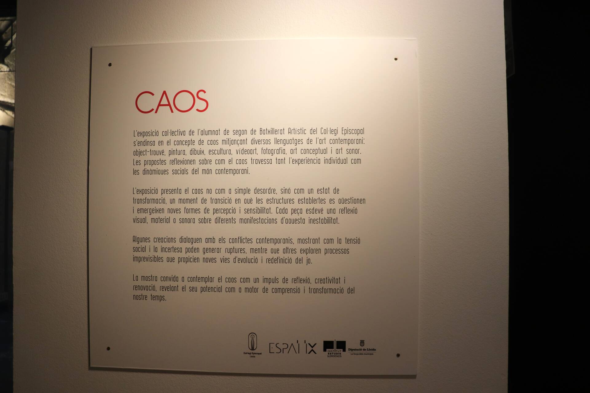 ‘Caos’ és una mostra col·lectiva que reuneix obres de pintura, vídeo, escultura i fotografia creades per l’alumnat de l’Episcopal. La mostra explora el caos com a espai de transformació, ruptura i canvi, i s’endinsa en aquest concepte a través de diversos llenguatges de l’art contemporani: objet-trouvé, pintura, dibuix, escultura, vídeoart, fotografia, art conceptual i art sonor.